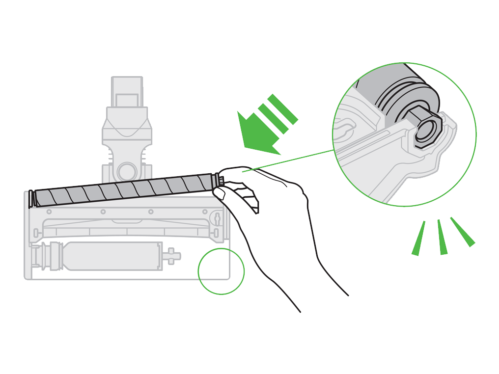 Gently slide the large brushbar away from the cleaner head and remove the end cap from the brushbar.