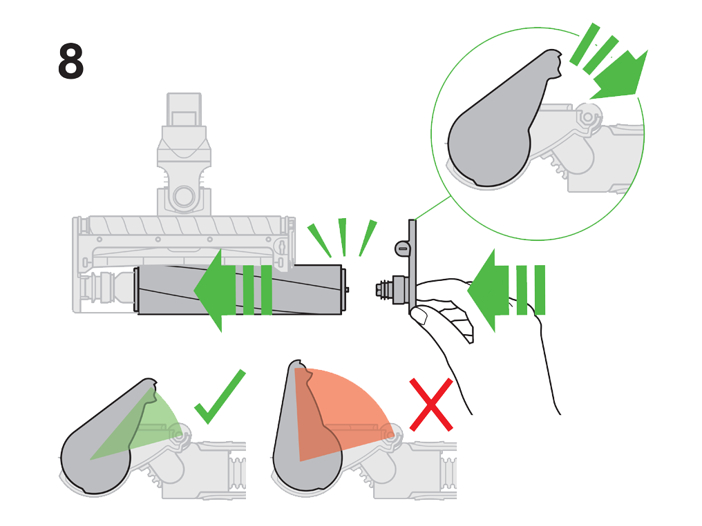 Slide the large brushbar back onto the cleaner head around the motor. Once in place rotate the end cap back into the closed position.