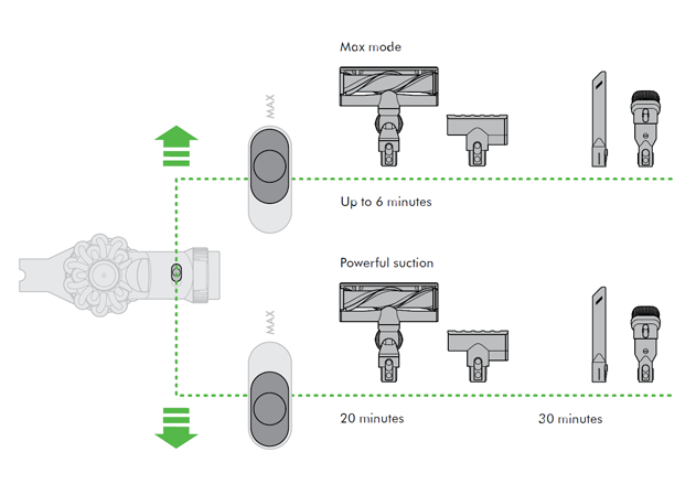 Your Dyson handheld is designed to give constant suction. When fully charged your Dyson handheld will give between 6 and 30 minutes of powerful constant suction depending on the power mode and tool selected.