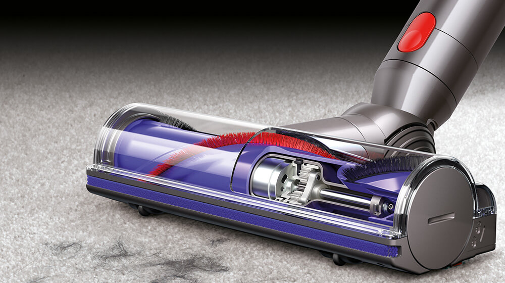 Soft woven nylon traps large debris, whilst anti-static carbon fibre filaments remove fine dust. A direct-drive motor sits within the roller, allowing full-width, edge to edge cleaning.